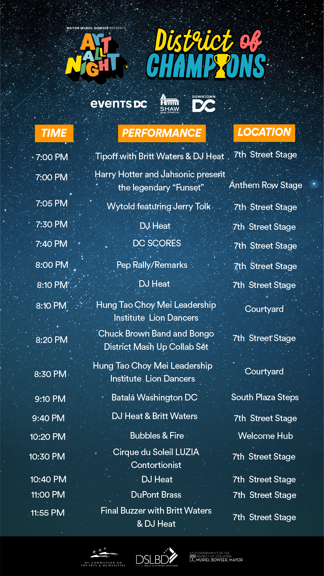 Britt Waters | DJ Heat | Harry Hotter and Jahsonic present the legendary “Funset” | Wytold featuring Jerry Tolk | DC SCORES | Hung Tao Choy Mei Leadership Institute Lion and Dragon Dancers| Chuck Brown Band and Bongo District Mash Up Collab Set | Batalá Washington DC| Bubbles & Fire | Cirque du Soleil LUZIA Contortionist | DuPont Brass