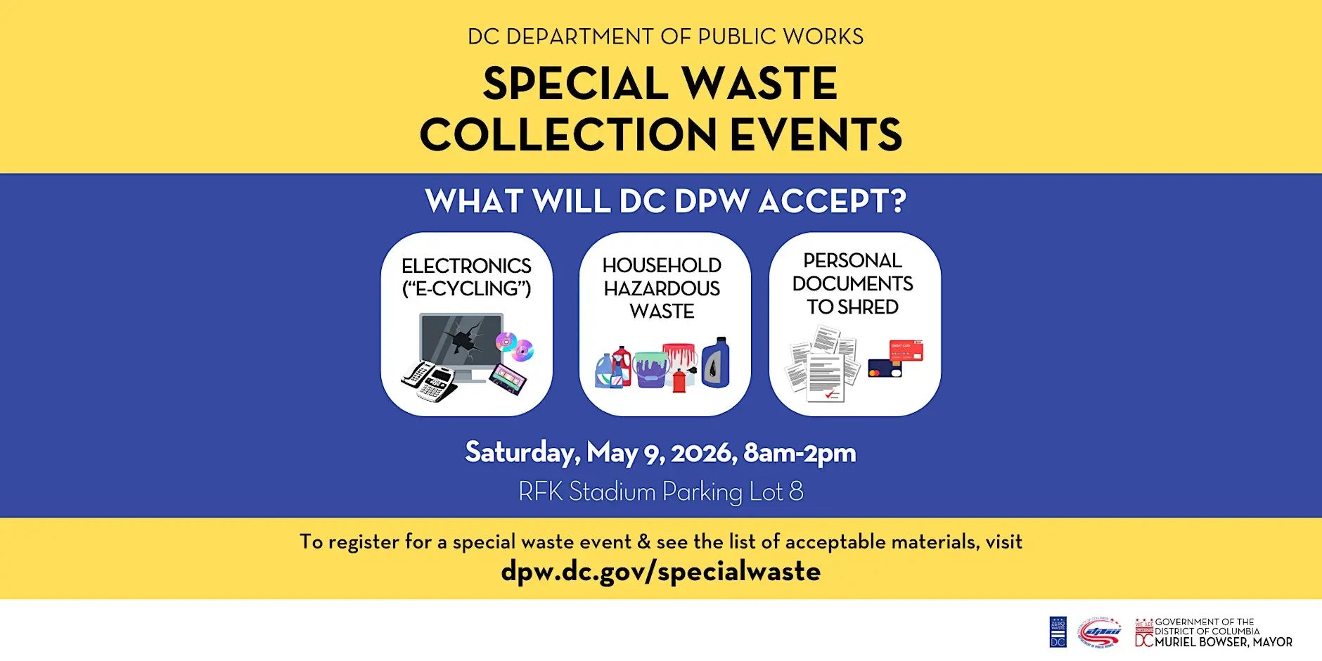 DC DPW’s Special Waste Collection Event, scheduled for Saturday, May 9, 2026, will be held atRFK Stadium's Parking Lot 8.