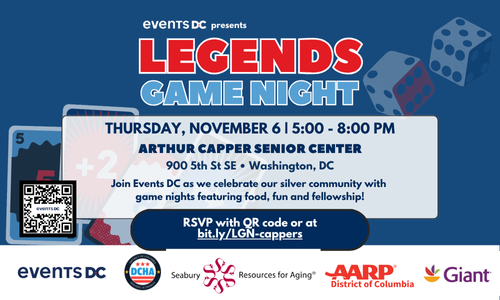 Events DC invites you to Legends Game Nights! These four game nights will take place across all of the District’s quadrants and will be an evening filled with array of activities, including dancing, classic board and card games, digital and arcade games, crafts and fellowship over food. This event is free and open to the public.
