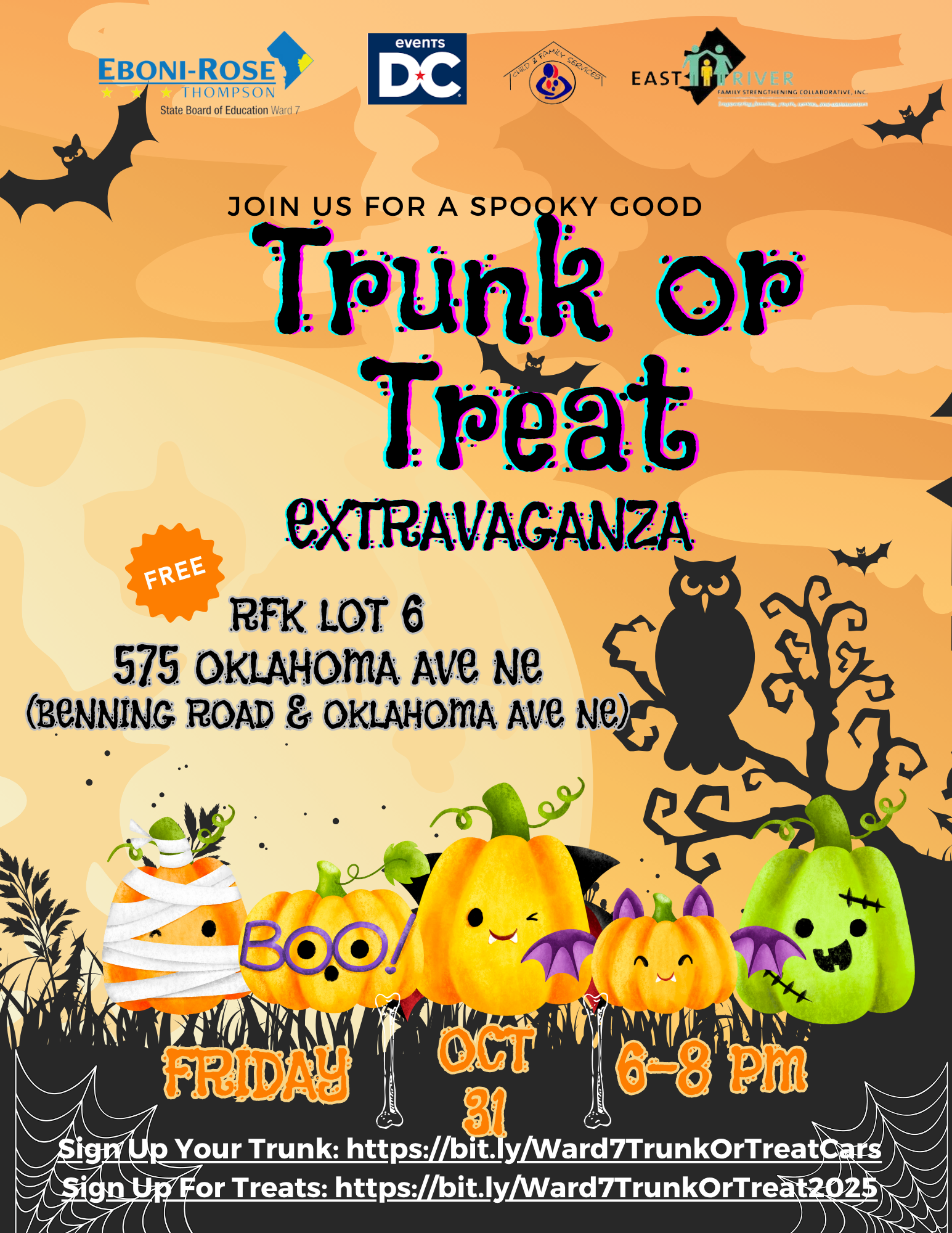 Halloween is a day so many of our children look forward to, but safety concerns often arise with traditional trick-or-treating. Ward 7’s 3rd Annual “Trunk or Treat Extravaganza” prioritizes safety and brings together families, schools, and the larger community in a fun and secure environment for families to celebrate Halloween, while keeping our children safe and promoting community unity.