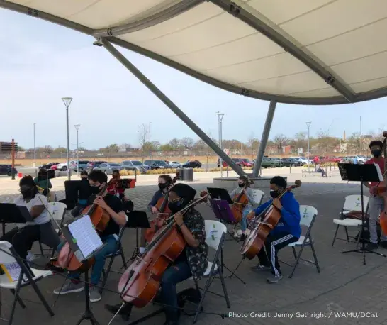 Late last month, a small group of students in the DC Youth Orchestra Program gathered for their first face-to-face rehearsal since March 2020. The highly anticipated outdoor, physically distanced rehearsal took place under The Fields at RFK Campus’ Celebration Pavilion. The event was outside and capped at 30 people and all participants wore masks.