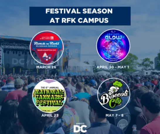 Events DC is proud to host a wide spectrum of major festivals and events at the RFK Campus this spring, marking a much-anticipated return of large-scale, outdoor festivals and celebrations. We look forward to bringing together residents and visitors from across the city and around the world for dynamic and diverse event experiences across music, sports, culture and more.