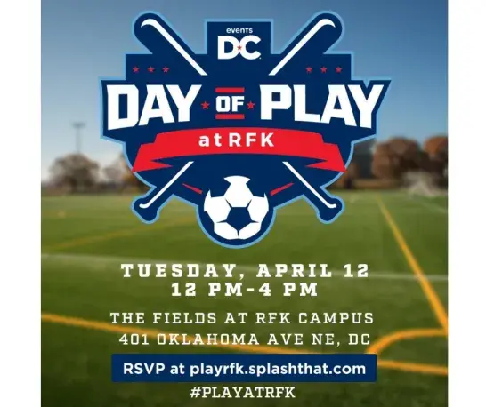 Join us for a Day of Play at RFK on Tuesday, April 12 from 12 – 4 PM, with your friends, family, or neighbors during Spring Break 2022. Events DC will host this free, field-based event to gather adults and youth in DC for a day of fun, family-friendly competition, featuring music, food trucks and activities for all ages.