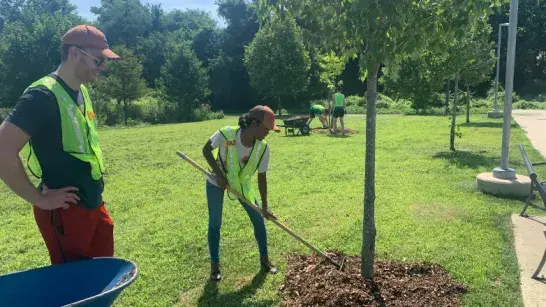 Several neighborhood volunteers recently mulched more than 60 young trees surrounding the Fields at RFK and along parking lots near Benning Road and Oklahoma Avenue at the RFK Campus.